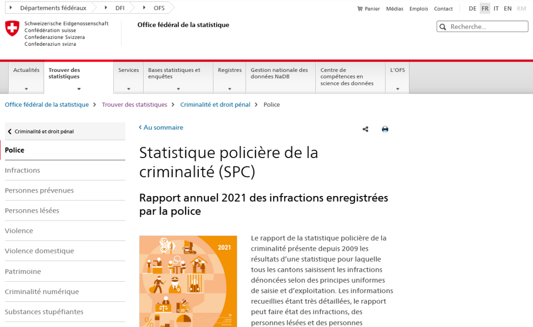 Il est important de souligner le fait que les chiffres de la criminalité dont on vient de parler ne correspondent pas totalement au nombre d’infractions qui ont réellement été commises en Suisse. La police n’a en effet connaissance que d’un certain nombre de délits. Les autres, soit la criminalité qui échappe aux statistiques officielles, sont connus sous le nom de «chiffres noirs». (Watson, 29.03.22)